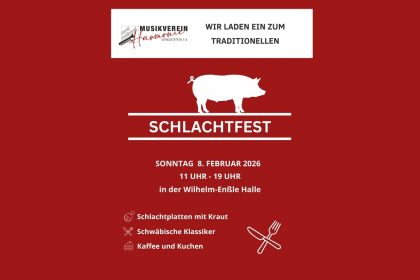 Der Musikverein Harmonie Geradstetten lädt am Sonntag, 08. Februar von 11 bis 19 Uhr zum Schlachtfest in die Wilhelm-Enssle-Halle nach Remshalden Geradstetten ein. Das beliebte Fest, das viele Jahre lang vom Männergesangverein Geradstetten ausgerichtet wurde, soll mit dem Musikverein in bewährter Qualität weiterleben. …