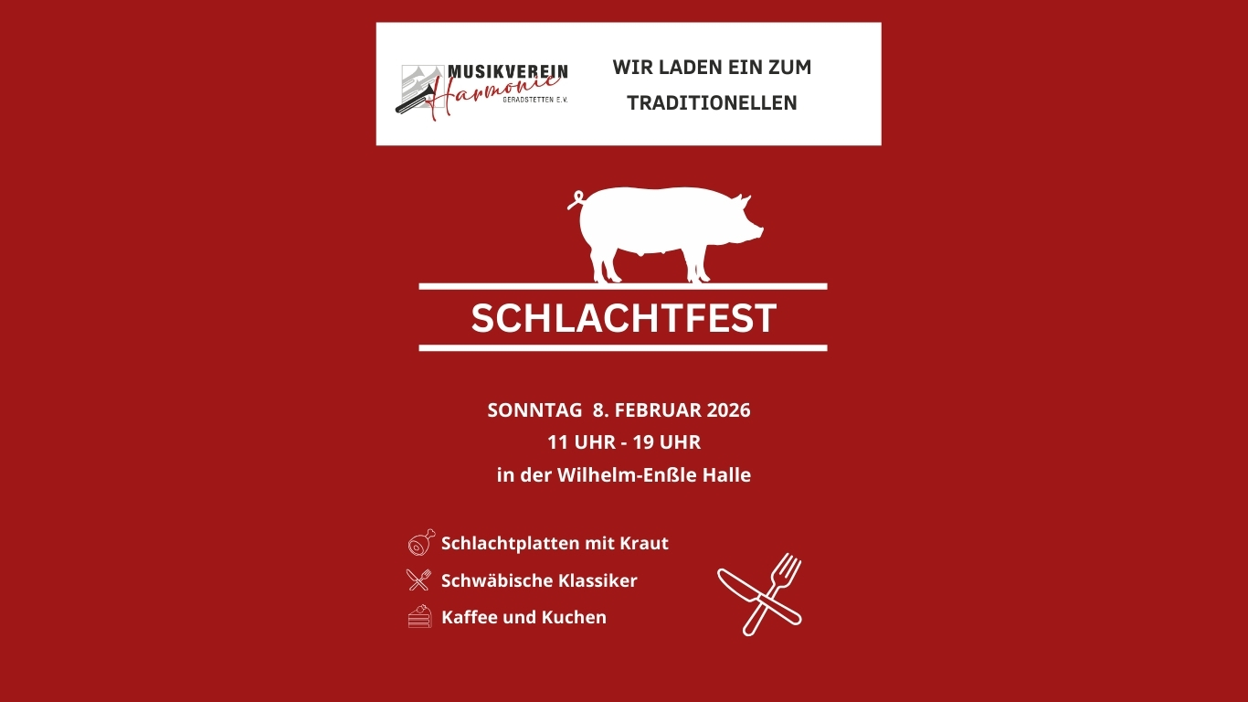 Der Musikverein Harmonie Geradstetten lädt am Sonntag, 08. Februar von 11 bis 19 Uhr zum Schlachtfest in die Wilhelm-Enssle-Halle nach Remshalden Geradstetten ein. Das beliebte Fest, das viele Jahre lang vom Männergesangverein Geradstetten ausgerichtet wurde, soll mit dem Musikverein in bewährter Qualität weiterleben. Um die übernommenen großen Fußstapfen ordentlich auszufüllen, haben sich das Orga-Team des Musikvereins und alle Musiker in den letzten Wochen gut gerüstet.